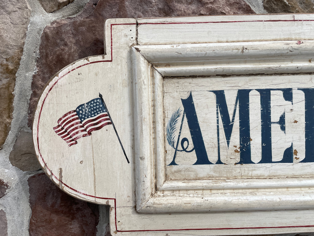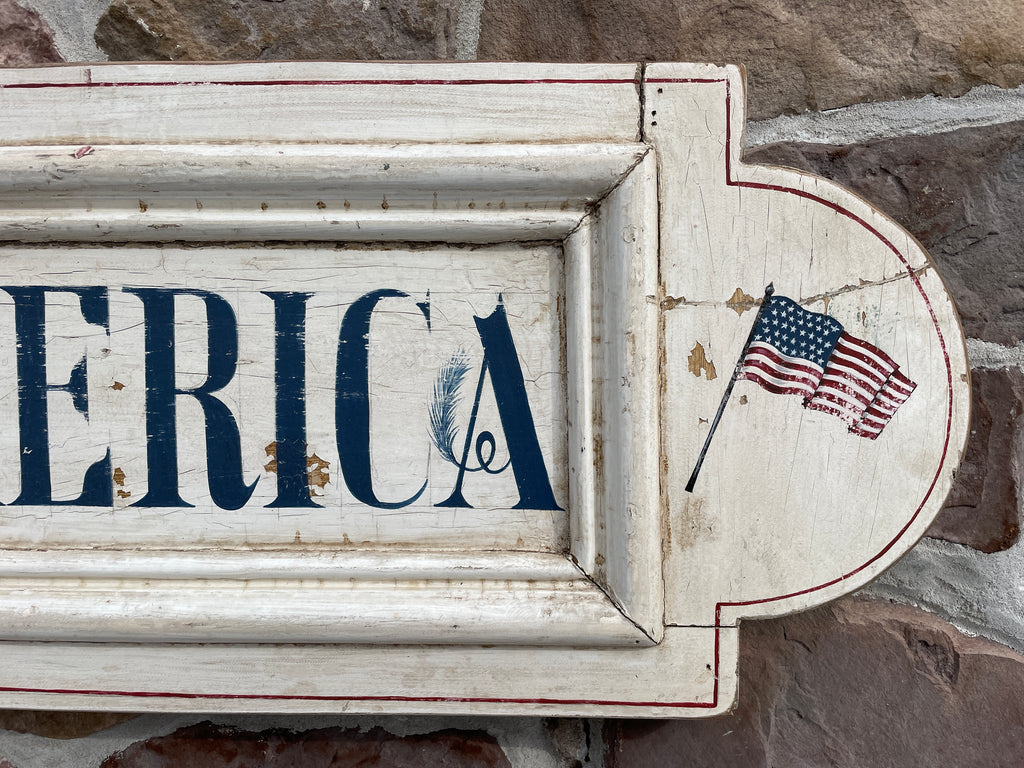 Home › Current Inventory › America (with flags) America (with flags) 13x34 Done on part of a salvaged antique door in original white paint, with painted American flags and lettering in navy with red accents. Default Title - $ 225.00 $ 225.00 Tweet Pin It