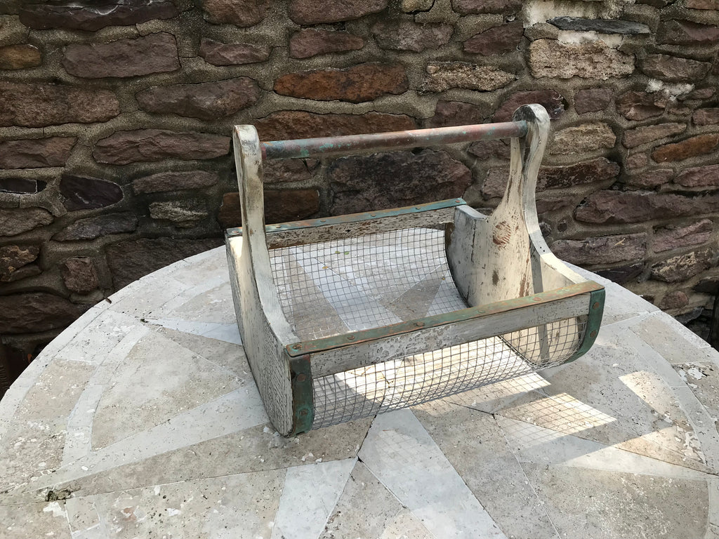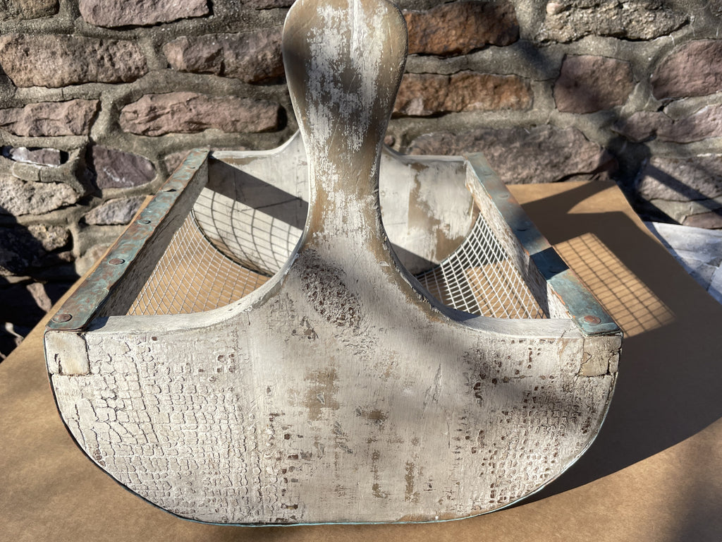Offering a handmade rustic garden hod that blends utility and craftsmanship. Inspired by traditional New England harvest baskets, the form traces back to coastal clam‑gathering hods used for collecting and rinsing shellfish. Built from antique wood and galvanized wire mesh, it features scrolled wooden sides with a copper handle, and copper banding details that add warmth and durability. Ideal for harvesting vegetables, rinsing produce, or displaying seasonal goods.