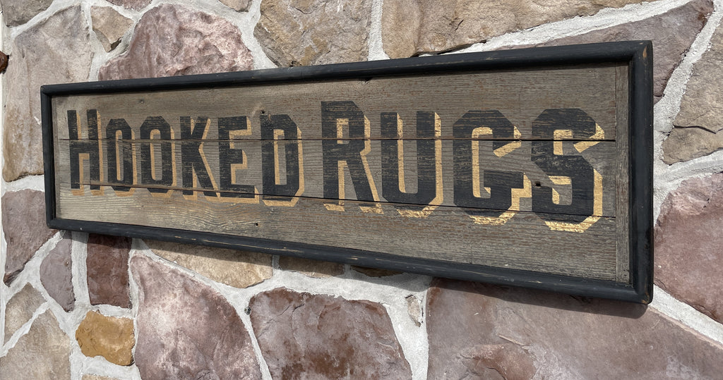 Home › Current Inventory › Hooked Rugs Sale Hooked Rugs 14x40 Painted on weathered boards in original aged greyish white paint, with a frame in half-round black molding. Features black letters and a thick shadow in gold. Default Title - $ 275.00 $ 325.00 $ 275.00 Tweet Pin It