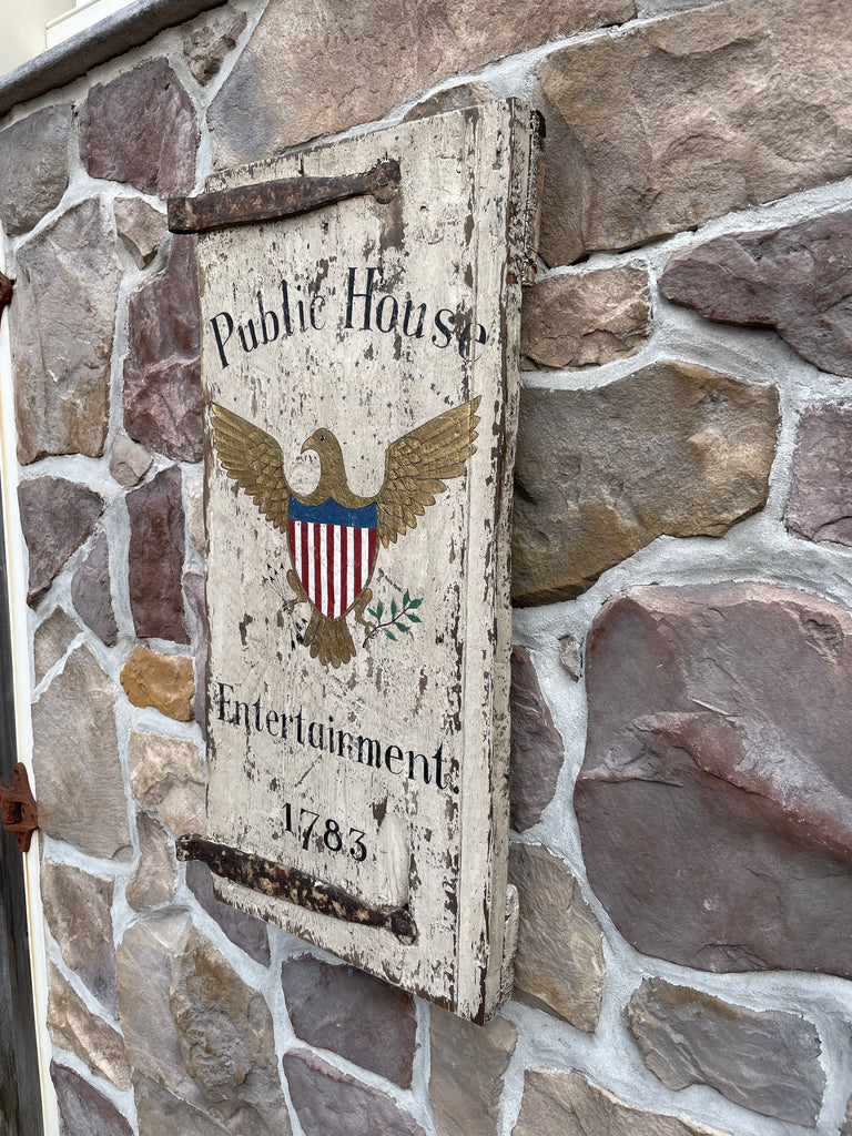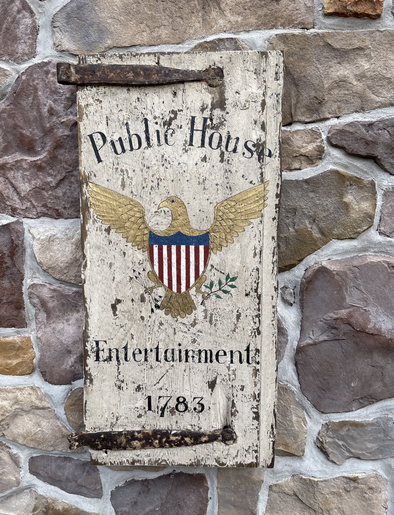 Home › Current Inventory › Public House-Entertainment Tavern sign Public House-Entertainment Tavern sign 31Hx16W Tavern sign painted on a small antique door in old, aged white pain with original strap hinges and battens on back. Default Title - $ 349.00 $ 349.00 Tweet Pin It