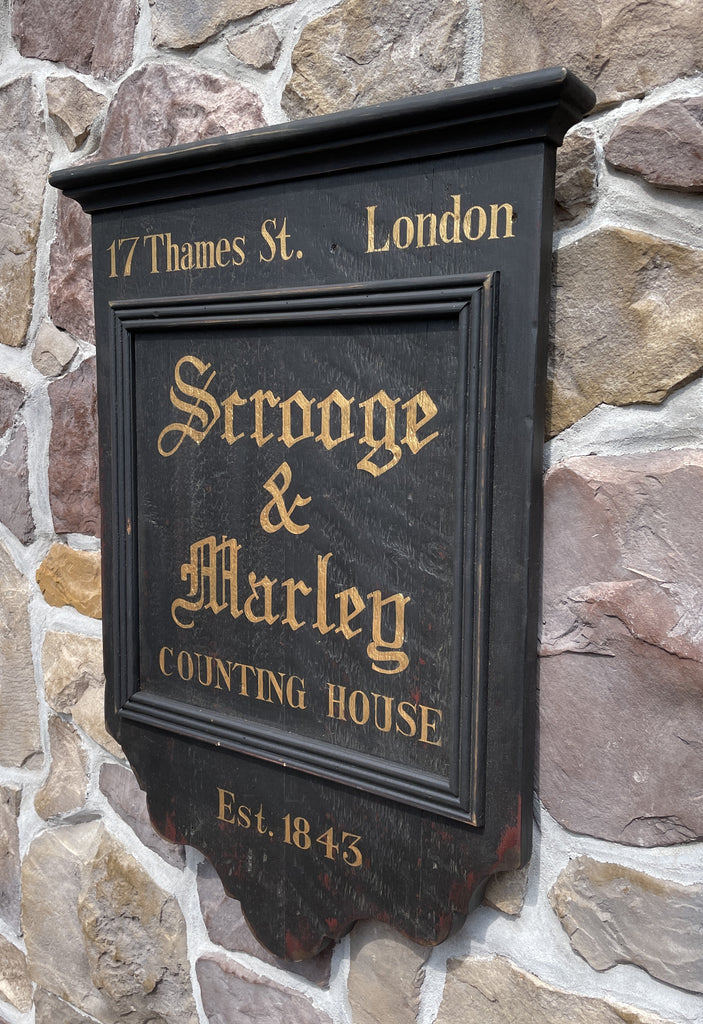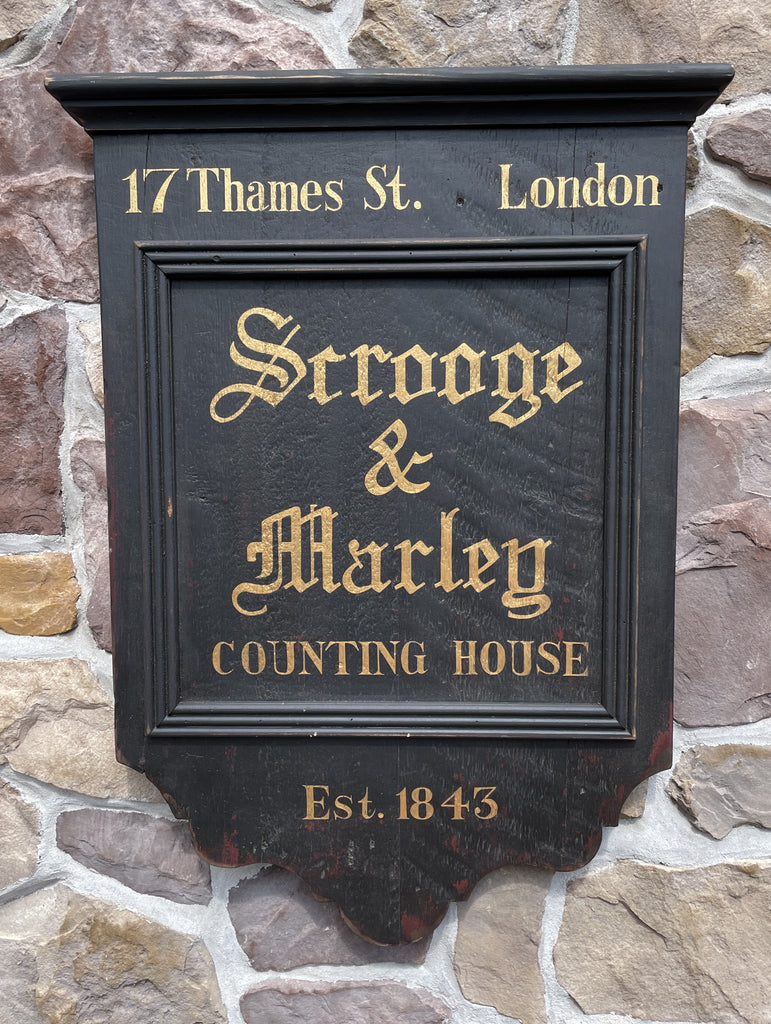 33x24  Inspired by Dicken's classic "A Christmas Carol", this sign is done on antique boards in black paint, with gold lettering.  Features a beaded interior molding and topped with a crown molding.