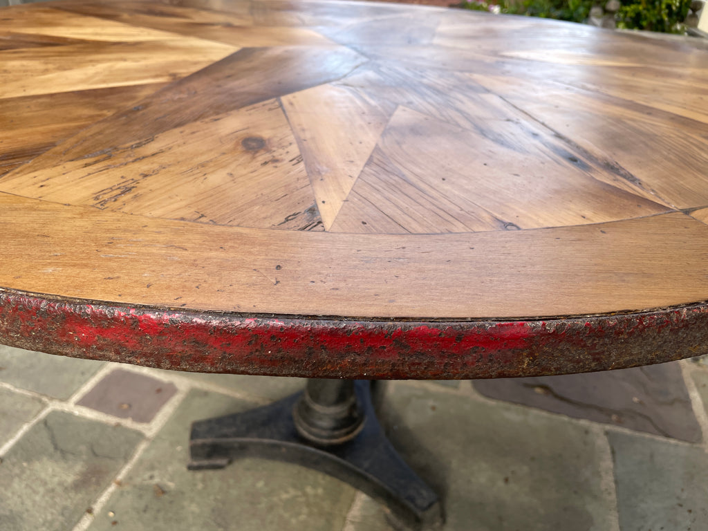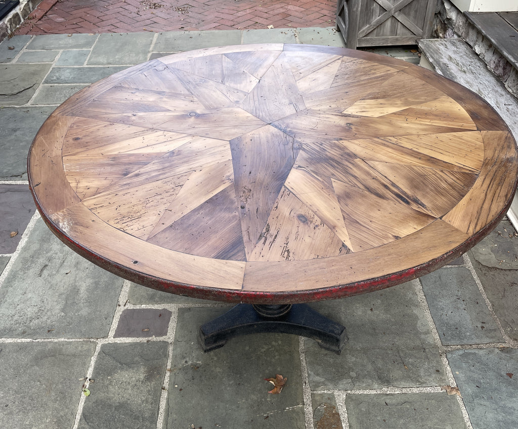 Handcrafted 48" round table featuring an inlaid compass rose design made from reclaimed pine, framed in iron salvaged from an antique wagon wheel. The base is a vintage cast iron pedestal, sturdy and sculptural in black.