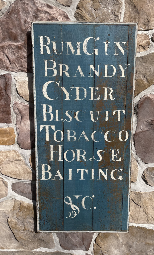 Home › Tavern Signs › RumGin Brandy RumGin Brandy 38x17 This is taken from an early New England tavern sign, and is done on antique boards in original blue paint. It features breadboard ends, with lettering in white or gold. Please specify a preference. Thanks! Default Title - $ 349.00 $ 349.00 Tweet Pin It