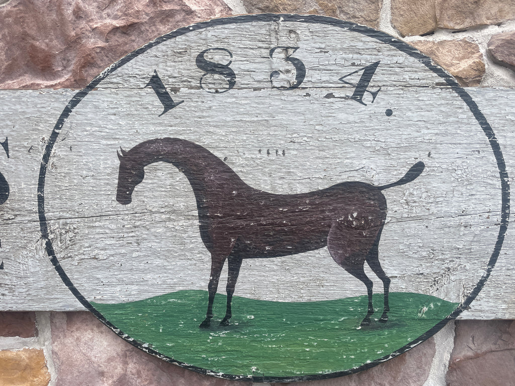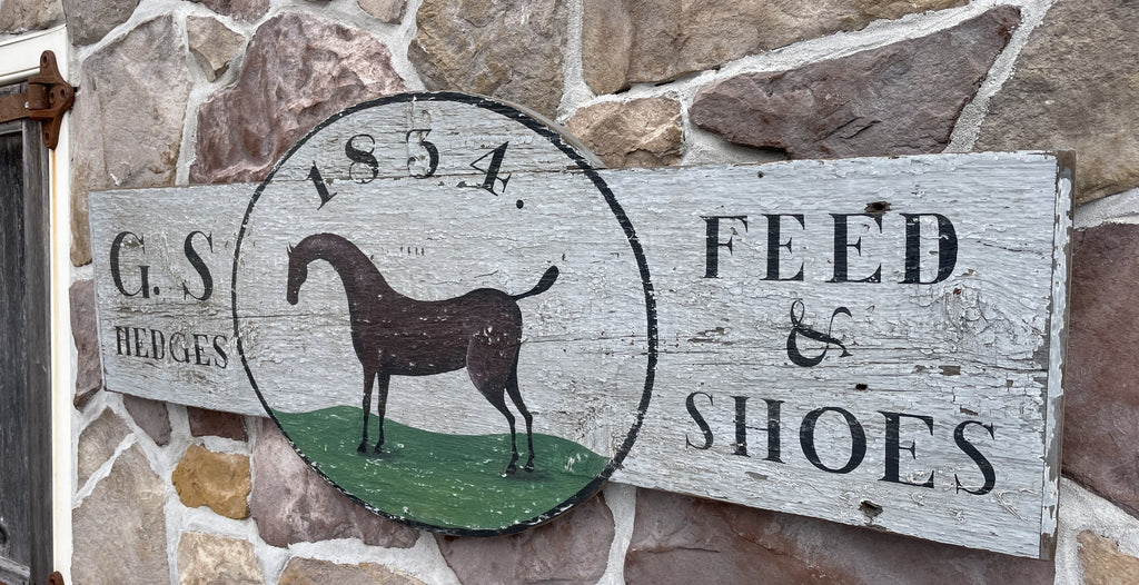Home › Trade Signs › GS Hedges, Feed & Shoes GS Hedges, Feed & Shoes 19x47 This horse trade sign is done on antique boards in original aged grey paint, with black trim and letters. Default Title - $ 375.00 $ 375.00 Tweet Pin It